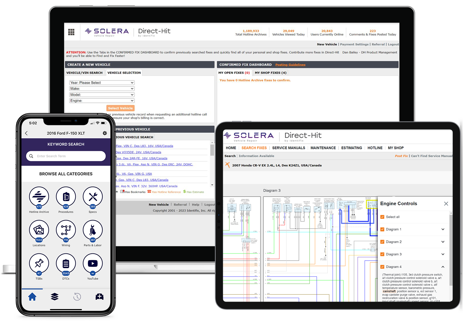 Identifix, a Solera company, supplies a suite of products that help auto repair shops grow their business and become more profitable. For repairs, our flagship Direct-Hit® auto repair information software offers over 3 million technician confirmed fixes, OEM manuals, wiring diagrams, labor guides, as well as a full library of helpful automotive training modules. We also provide technician-to-technician support from our live Direct-Help experts who offer 1-on-1 automotive repair and diagnostic assistance. For shop management, we offer industry leading Identifix Shop Manager platform. For digital marketing, we offer a full suite of services that help shops find new customers and communicate with current ones.